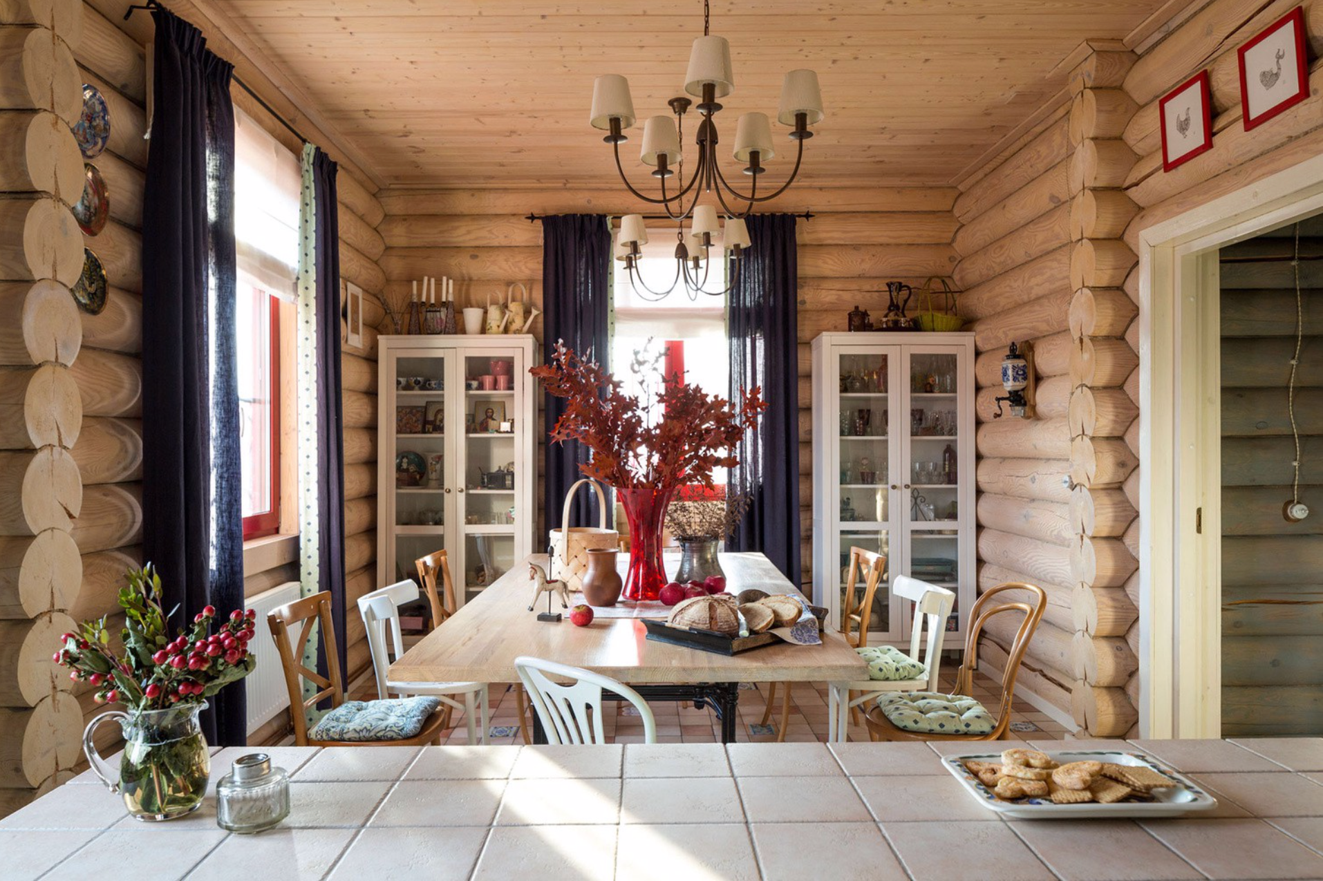 Летняя кухня из оцилиндрованного бревна с большими окнами в пол