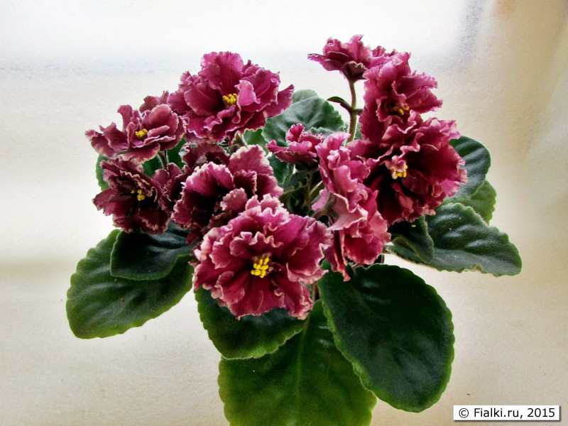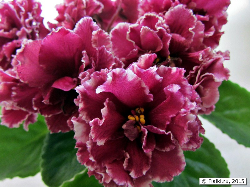 Крупные полумахровые и махровые цветы с тонкой, порой, прерывистой белой волнистой каймой. Цвет густой бордово-красный и тонкая белая кайма хорошо оттеняет пушистые волнистые лепестки. Цветоносы крепкие не высокие, на каждом располагается от 3 до 5 цветков. Цветение продолжительное и обильное уже с первого цветения. При недостаточном освещении особенно при фитильном поливе цветоносы могут вытягиваться и под тяжестью цветов ложатся на розетку.