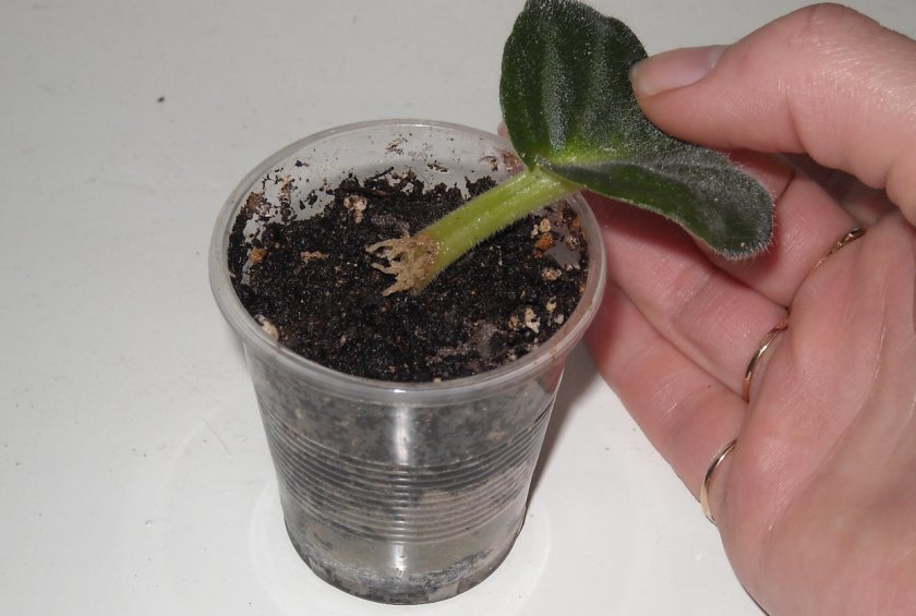 Лист аккуратно отламывают, а затем делают срез под углом 45 градусов и помещают в стакан с водой или смесь песка и почвы. Черенок заглубляют не более чем на 1 сантиметр. При весеннем укоренении детки на черенке появляются спустя 2 месяца.