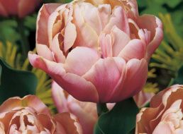 Кенари Бриллиантс – очень ранний пион, расцветает в апреле-мае. Махровые плотные соцветия персикового колера у основания лепестков имеют нежно-розовый оттенок. Края лепестков волнистые, цветы 16-20 см в диаметре, с нежным сладким ароматом. Период цветения – 15-20 дней.