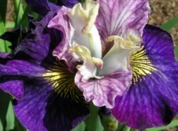 Из описания: «Полумахровый. Среднего срока цветения. Цветок кремово-белый с поразительным контрастным фиолетово-красным пятном в основании лепестков. Аромат лёгкий. Куст высотой 80-90 см, хорошей формы. Стебли сильные. Листья тёмно-зелёные. Имеет сходство с пионом горным (Paeonia rockii)».