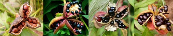 Плоды представляют из себя сложную многолистовку. Каждая листовка содержит несколько крупных округлых семян черного цвета. У некоторых видов пионов плоды весьма декоративны.