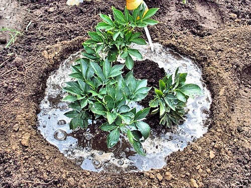 Кстати, если Вы намерены устроить у себя на участке небольшой питомник с пионами для их масштабного разведения, то вместо отдельных ям можно использовать траншейный метод посадки. Траншеи делают той же ширины и глубины, что и ямы, а потом заполняют аналогичной питательной смесью.