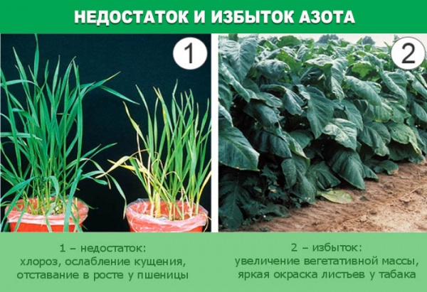 При избытке азота активно развивается зеленая масса, растение вытягивается, листья бледнеют. В отдельных случаях могут наблюдаться ожоги корневой системы, а, следовательно, полная гибель растения.