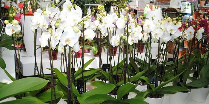 Обычно в магазине приобретают цветущее растение — только так можно определить вид, размер и оттенок образующегося цветка. Поскольку перемещение орхидеи в новое помещение – это всегда определённый стресс, первое цветение обычно не бывает продолжительным. Цветонос вместе с бутонами засыхает и опадает, и у растения наступает период относительного покоя.