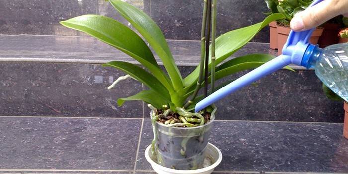 Орхидею поливают несколькими способами. Это может быть поверхностный полив из лейки. Многие осуществляют его методом погружения, опуская цветочный горшок минут на 15 в ёмкость с водой. Через дренажные отверстия вода насыщает грунт до необходимой консистенции.